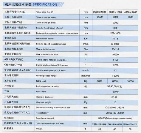 [特点与用途] ●机床采用定梁式龙门结构,主轴具有可回转的A,C轴,可实现五轴联动进行空间曲面 加工及大型复杂形状模具的高速高效加工。 ●横梁导轨倾斜30度,采用贴塑和滚动块的复合导轨形式。 ●机床主轴采用电主轴结构,最高转速可达10000转/分。 ●主轴箱采用液压平衡装置,电主轴定子和精密高速轴承采用恒温水冷却降温。 ●卸荷式主轴松刀结构,松刀时主轴不受力。 ●基础大件按高刚性高抗震性要求最新设计。按用户要求可配置光栅,实现闭环控制。 ●CNC采用SIEMENS 840D数字式控制系统。