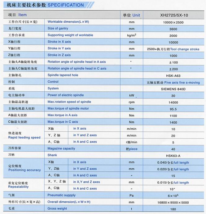[特点与用途] 本机床是一台数控桥式五联动加工中心,它具有X、Y、Z三个直线运动的数控坐标轴和A、C两个旋转数控坐标轴,各坐标既可单独运动又可联动。该机床适用于各种板件、盘件、壳体件、模具以及具有多曲面的复杂零件的多品种中小批量生产,尤其适用于具有多曲面零件,如航空工业中的蜗轮、叶片、桁架等有色金属及轻合金零件的加工。